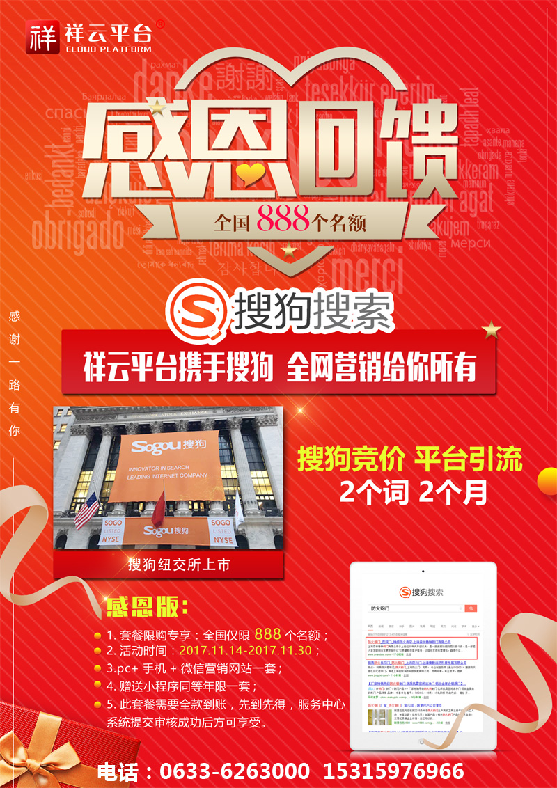 2017年11月9日,搜狗在紐交所上市,成為國(guó)內(nèi)第二大搜索引擎,祥云聯(lián)合搜狗,推出2017感恩鉅惠活動(dòng):凡簽約祥云營(yíng)銷(xiāo)型網(wǎng)站,即送搜狗競(jìng)價(jià)關(guān)鍵詞,兩個(gè)詞,兩個(gè)月!名額有限,先到先得!電話(huà):0633-6263000 15315976966