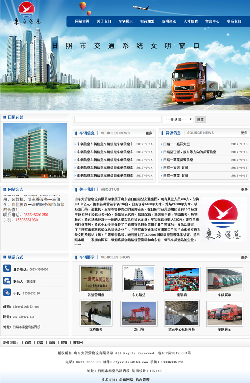 山東大沂蒙物流有限公司隸屬于山東省日照運(yùn)總交通集團(tuán),現(xiàn)有從業(yè)人員786人,總資產(chǎn)1.8億元,擁有各種營(yíng)運(yùn)車輛576臺(tái),自備倉庫6400平方米,堆場(chǎng)24000平方米,以及龍門吊、裝載機(jī)、叉車等各種類型的裝卸設(shè)備,在日照市及周邊地區(qū)設(shè)有16個(gè)經(jīng)營(yíng)單位和28個(gè)經(jīng)營(yíng)業(yè)務(wù)網(wǎng)點(diǎn),是集貨運(yùn)代理、信息配載、集裝箱中轉(zhuǎn)、物流服務(wù)、貨物聯(lián)運(yùn)、貨運(yùn)場(chǎng)站經(jīng)營(yíng)于一體的大型綜合性貨運(yùn)企業(yè),年實(shí)現(xiàn)營(yíng)業(yè)收入2億元,走在全市同行業(yè)前列。貨運(yùn)中心多年保持了“省級(jí)守合同重信用企業(yè)”等稱號(hào),并先后獲得了“日照市道路運(yùn)輸優(yōu)秀貨運(yùn)企業(yè)”、“日照市交通系統(tǒng)文明窗口”和“山東省交通系統(tǒng)文明貨運(yùn)站(場(chǎng))”等榮譽(yù)稱號(hào),順利通過了ISO9001國(guó)際質(zhì)量管理體系認(rèn)證,是日照市唯一一家擁有國(guó)家二級(jí)道路貨物運(yùn)輸經(jīng)營(yíng)資質(zhì)和山東省一級(jí)汽車貨運(yùn)站的企業(yè)。